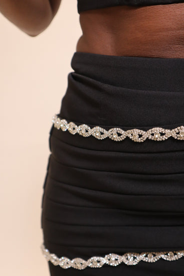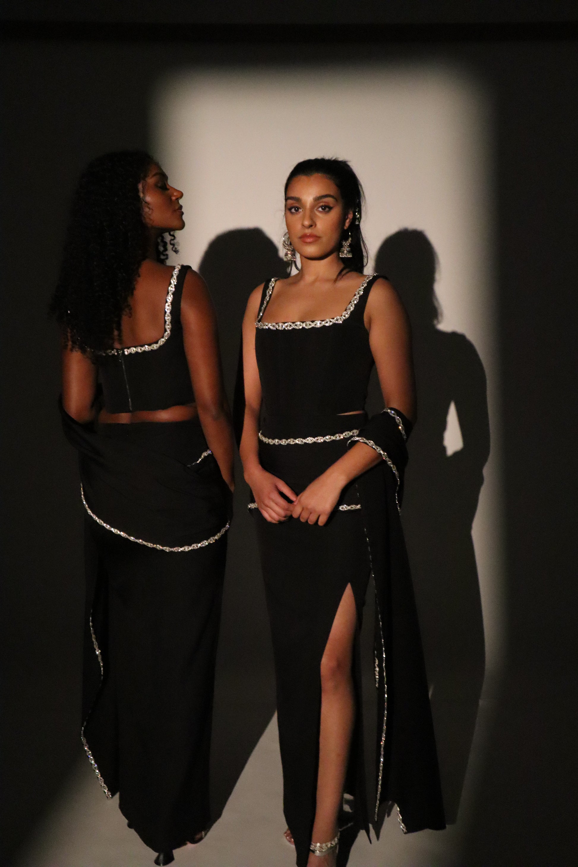 This figure-hugging saree skirt is crafted with a luxurious black fabric and adorned with a striking crystal trim. With a slit detail in the front for added shape, this elegant saree skirt will make a perfect statement piece for any occasion.