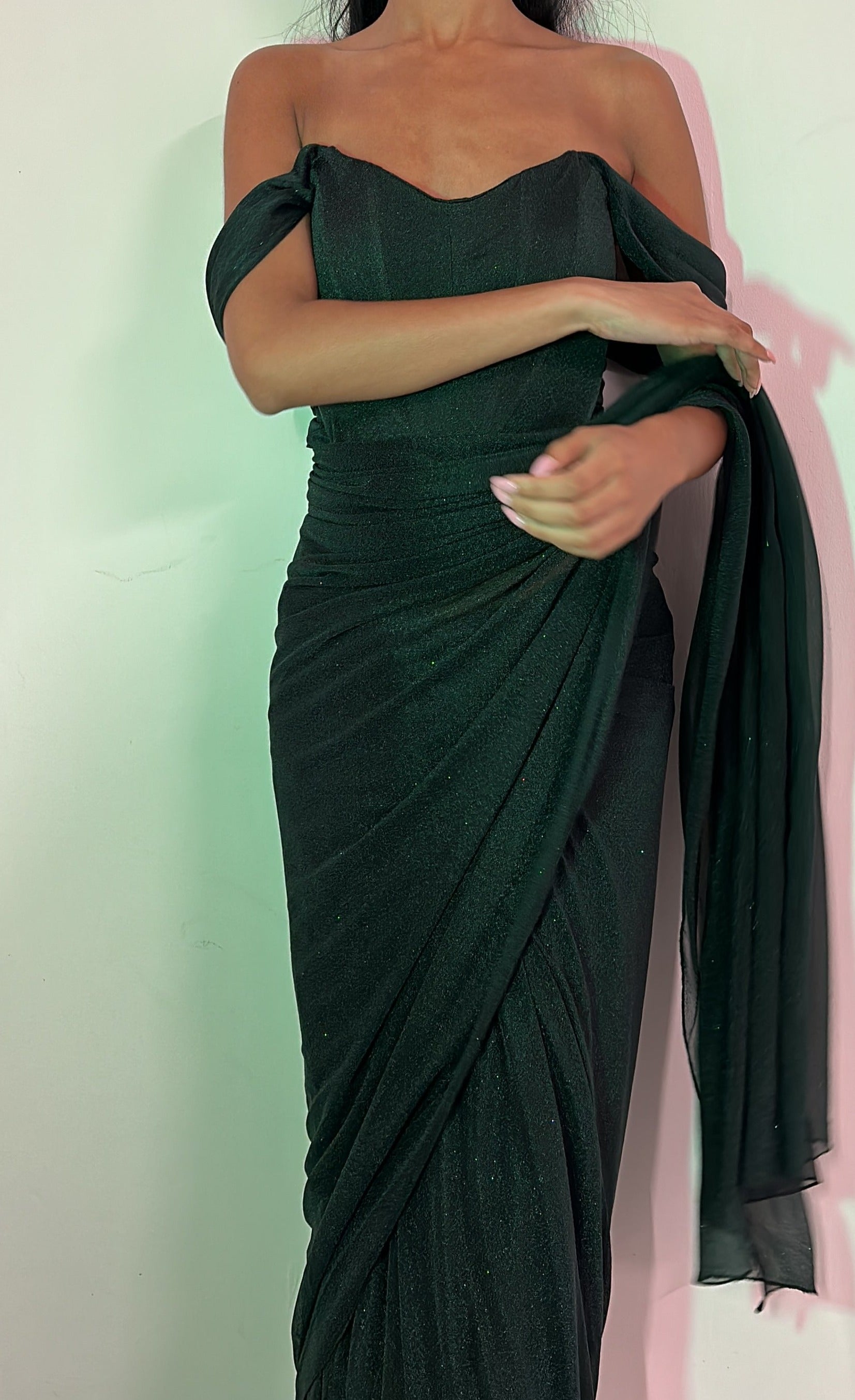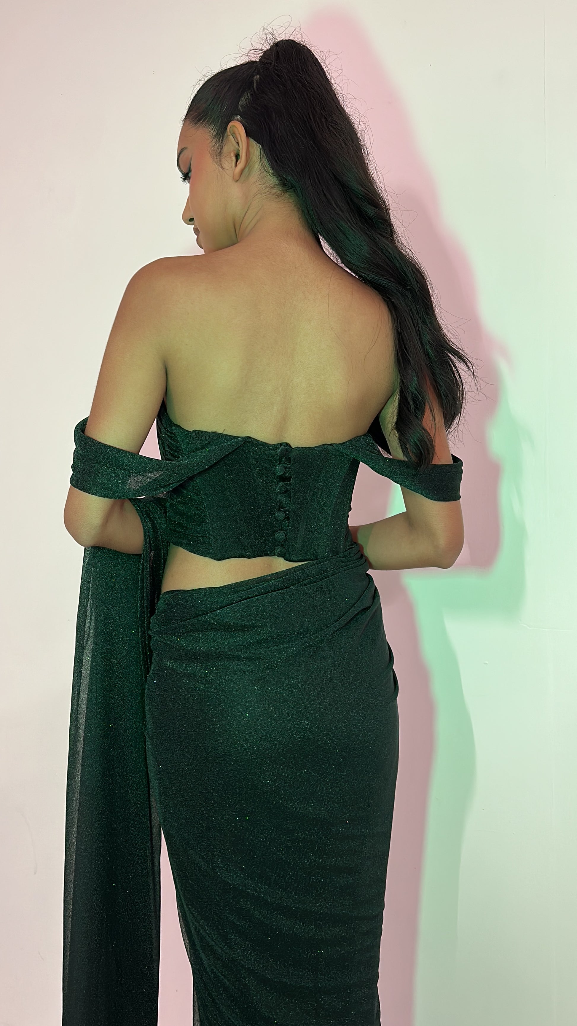 Introducing the Dark Green Corset Top Glitter Saree- a stunning and sophisticated piece that will make you stand out from the crowd. Featuring a beautiful dark green color, glitter detailing, and comfortable high-quality materials, this saree is perfect for any occasion. Elevate your style and order now to experience the benefits of this must-have piece for yourself!