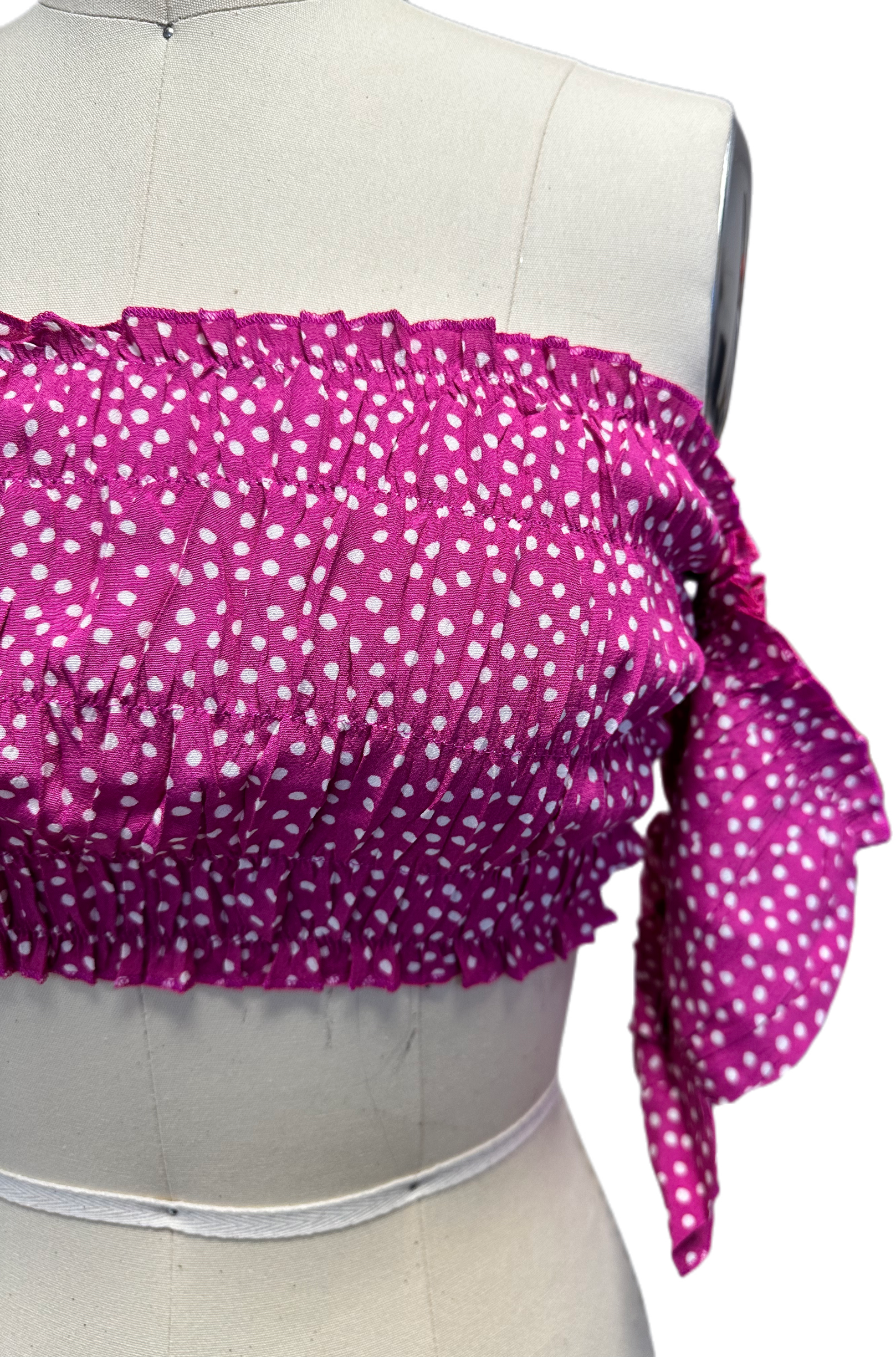 This dark pink polka dot saree features a luxurious design, with an elegant blend of colors that makes a bold statement. Perfect for any special occasion.