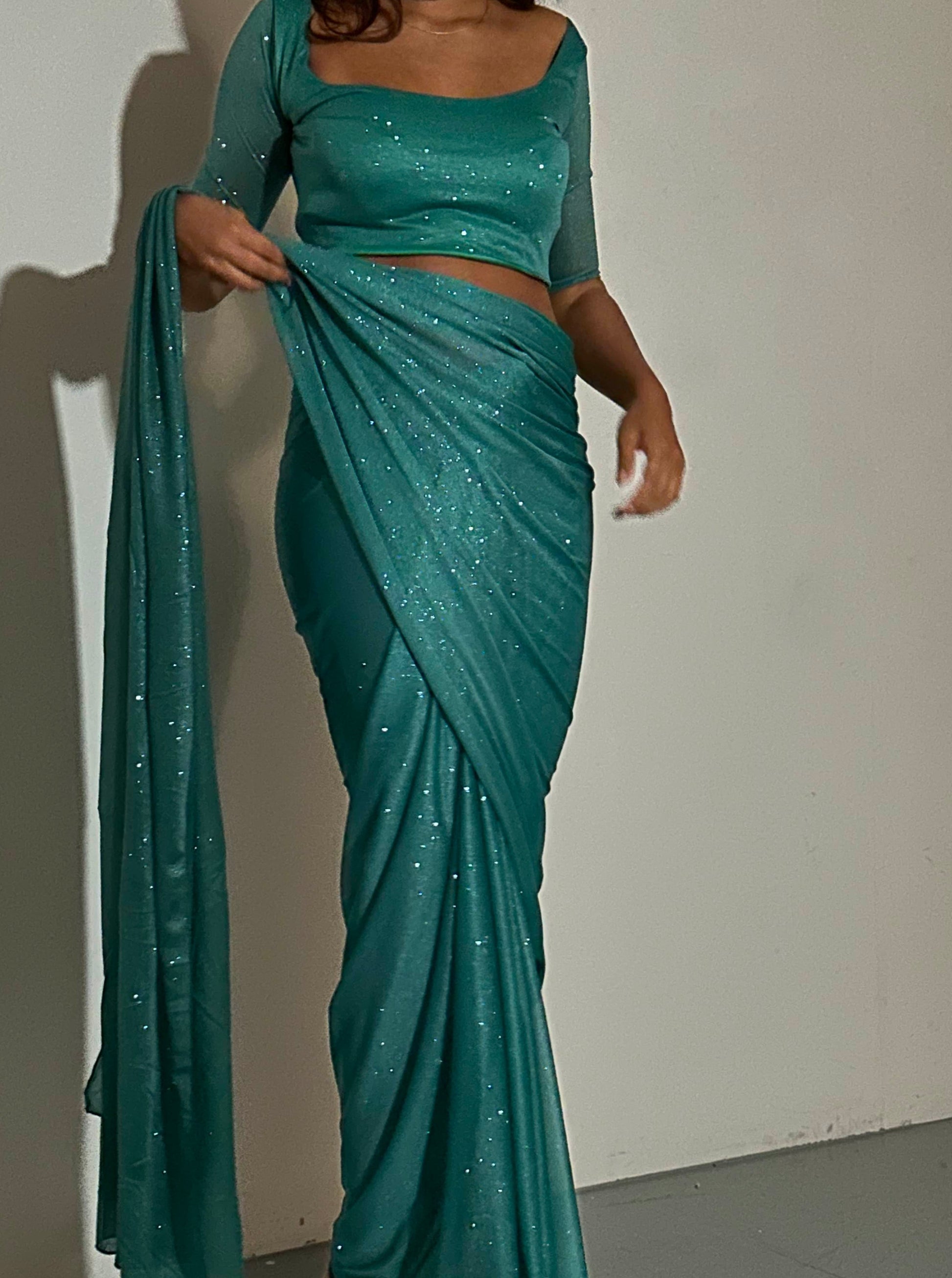 Indulge in simple luxury with our GLITTER SAREE SHORT SLEEVE GREEN GALAXY. The captivating design and elegant short sleeves make this saree stand out from the rest. Different from traditional sarees, this one will surely make you shine.