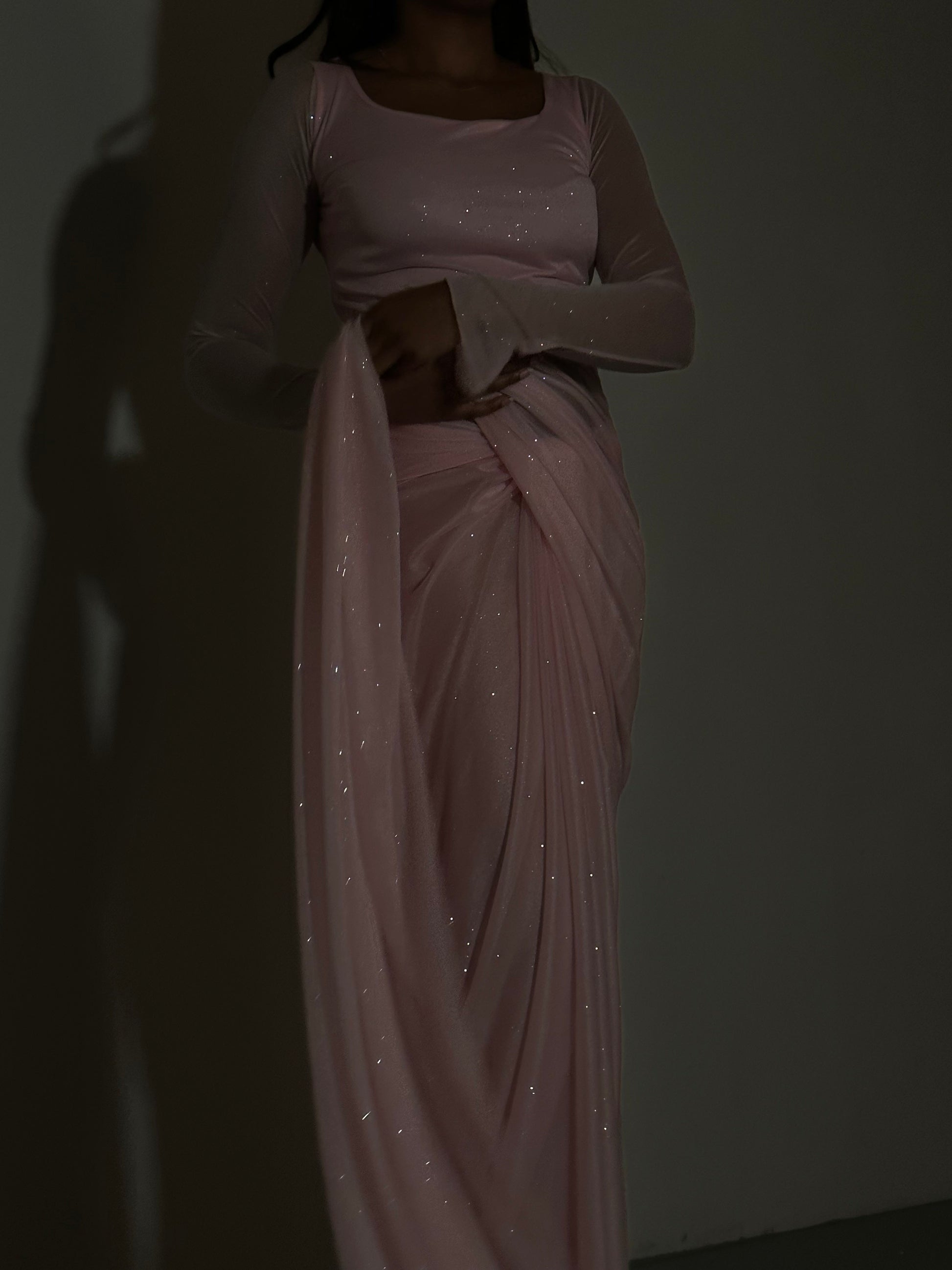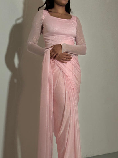 Experience simple luxury in our Glitter Saree Long Sleeve Rose Gold Galaxy. With elegant long sleeves and captivating glitter detailing, you'll shine like a galaxy all night long.