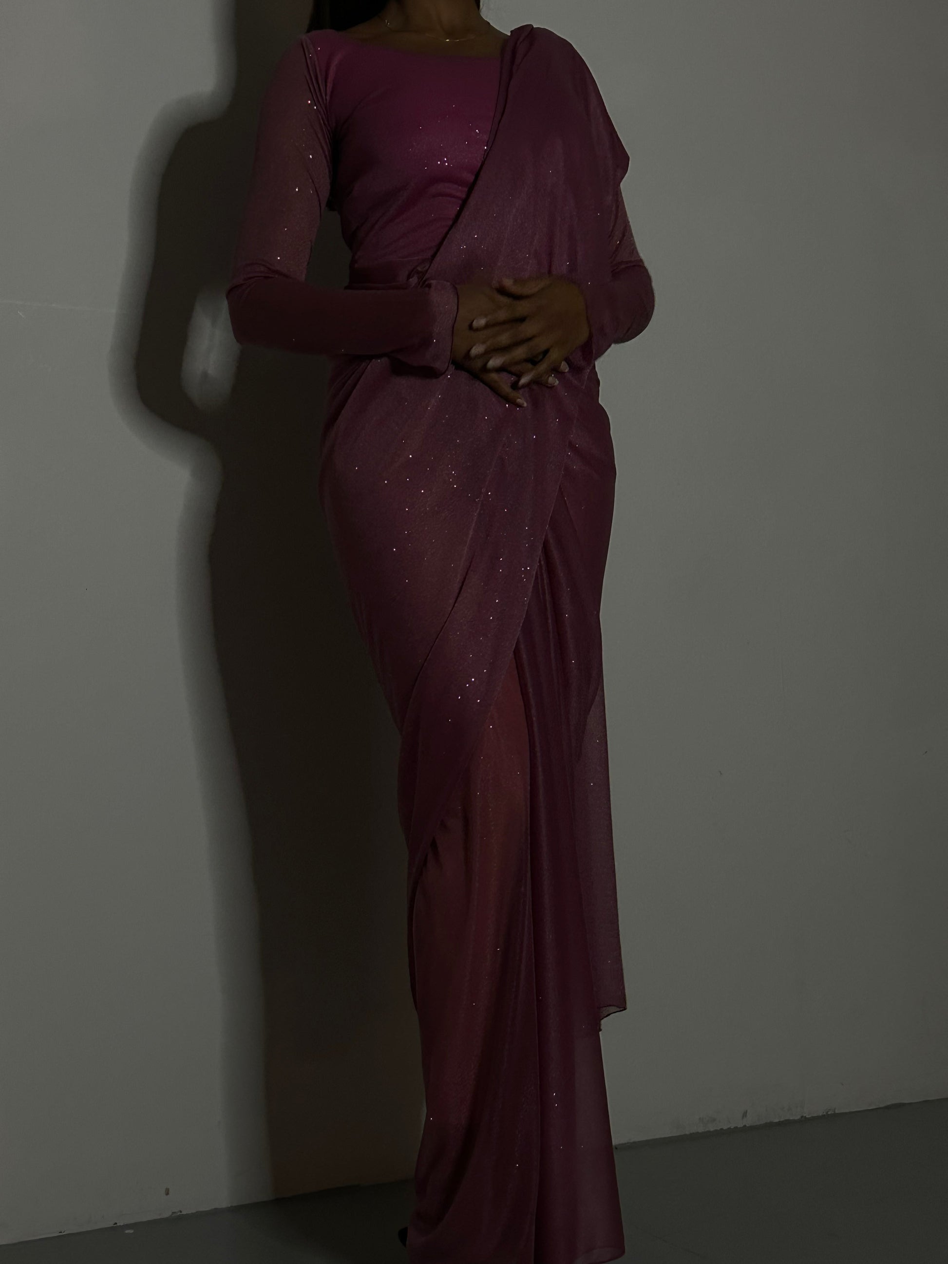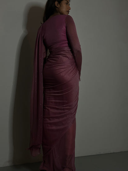 Experience simple luxury in our Glitter Saree Long Sleeve MAUVE Galaxy. With elegant long sleeves and captivating glitter detailing, you'll shine like a galaxy all night long.