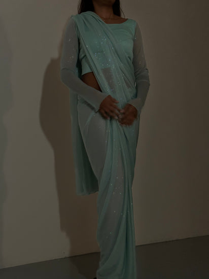 Experience simple luxury in our Glitter Saree Long Sleeve Light Blue Galaxy. With elegant long sleeves and captivating glitter detailing, you'll shine like a galaxy all night long.