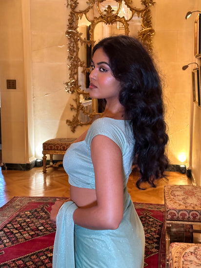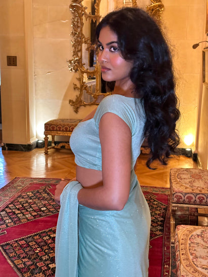 Indulge in simple luxury with our GLITTER SAREE SHORT SLEEVE SAGE GALAXY. The captivating design and elegant short sleeves make this saree stand out from the rest. Different from traditional sarees, this one will surely make you shine.