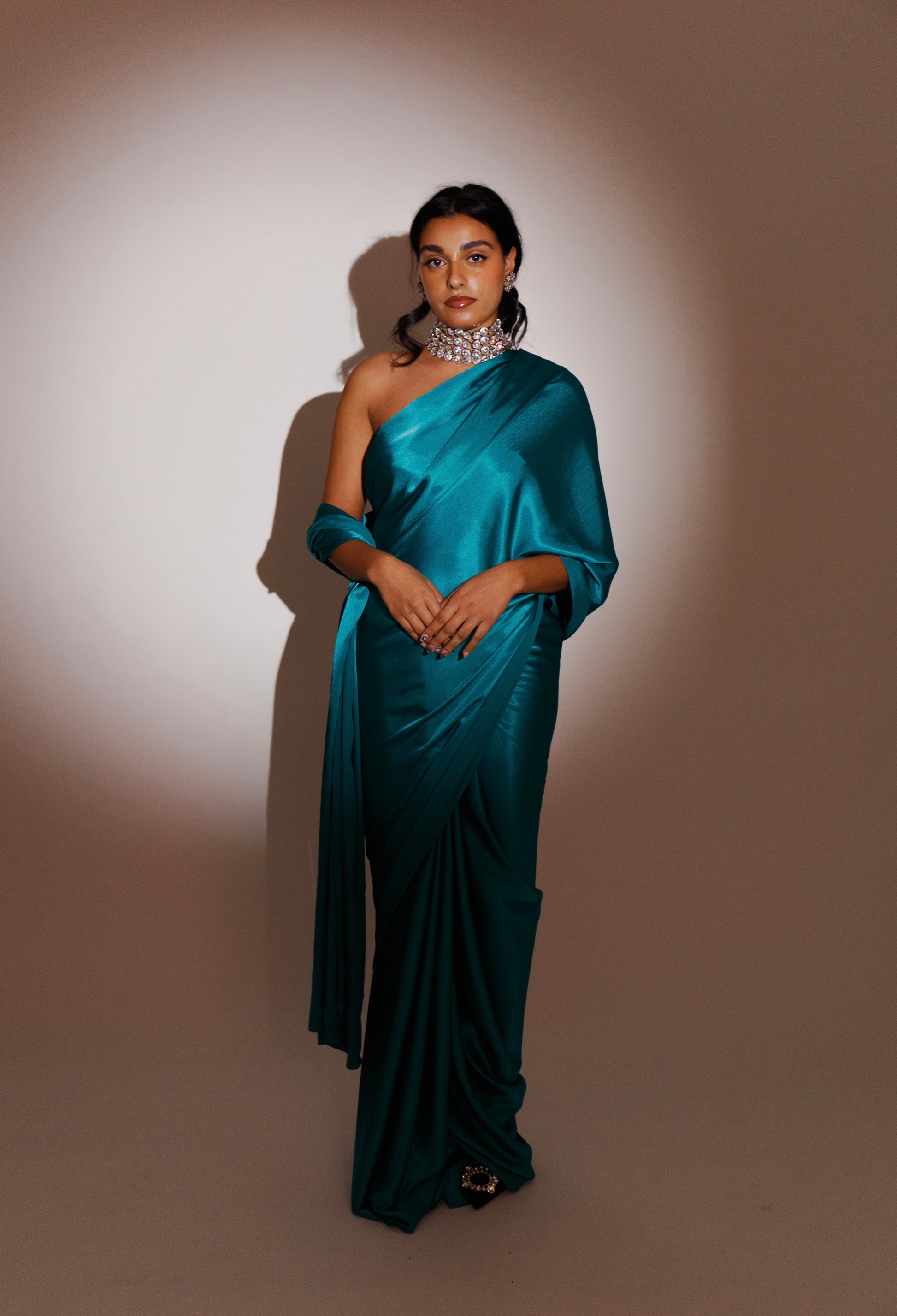 Elevate your wardrobe with this luxurious turquoise satin top featuring elegant spaghetti straps. Wear it with our matching turquoise ready-made saree for an opulent look.
